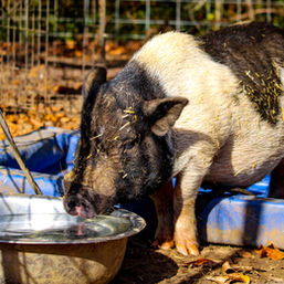 Cupcake’s exact age is unknown, but he was at least five years old when Serena rescued him after Hurricane Michael. Given the years he’s been with us, we know he’s now an older piggy. The combination of strain from his old injury and age-related arthritis has taken a toll on him. These days, he spends most of his time resting and relaxing and rarely chooses to walk around much. Though he's always up and about ready for mealtimes.